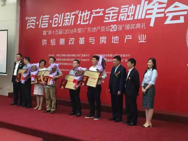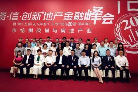 2016年7月6日,由中央媒體聯合工、農、中、建四大國有商業銀行廣東省分行等金融機構隆重舉辦的“資?信?創新”地產金融峰會暨“第十五屆(2016年度)廣東地產資信20強”頒獎典禮,盛大開幕。