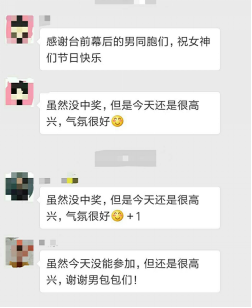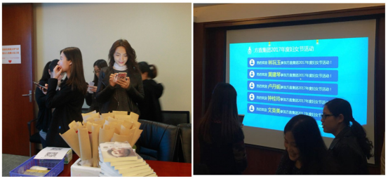 下午四點三十分,女同胞們陸續用手機掃碼簽到。看到大屏幕上同步顯示“熱烈歡迎XXX參加方直集團2017年度婦女節活動”時,有女同胞表示受寵若驚,同時感概“互聯網+”簽到真是方便快捷。