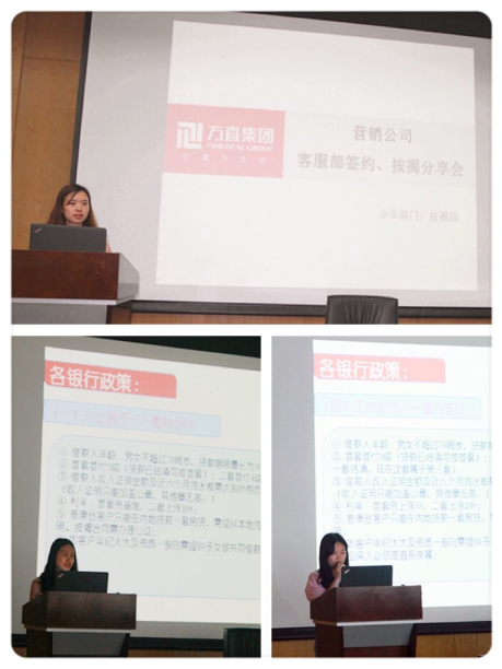 本次培訓分為兩個部分,一是合同簽約,二是按揭貸款。第一部分合同簽約由客服部王儷君主講,講師王儷君針對簽約事項詳細講解了簽約、按揭初審所需資料及合同簽約的流程;第二部分為按揭貸款,由客服按揭部田秋蟬、劉曉敏針對目前銀行的最新政策,為大家分析并整理了各個銀行詳細的按揭所需資料清單及應對方法。