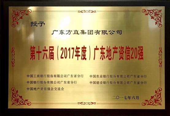 會上工、農、中、建四大國有銀行廣東省分行等機構正式對外公布了“第十六屆(2017年度)廣東地產資信20強”名單。該名單涵蓋了20家廣東本土龍頭房企,方直集團以守信創新的企業精神及成熟穩健的資產運作能力,再次蟬聯“廣東地產資信20強”稱號,成為連續四年蟬聯該項榮譽的房地產企業之一。