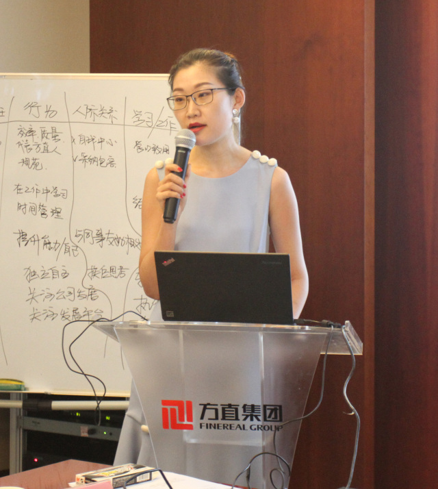 內(nèi)訓師王瑩為大家?guī)怼稄男@人到方直人的角色轉(zhuǎn)變》的分享。她以四個關鍵詞作為分享重點:“凡事有交代、件件有著落、事事有回音”的靠譜、作為人生驅(qū)動力的熱情、傾聽和尊重他人的謙虛、全力以赴的感恩。