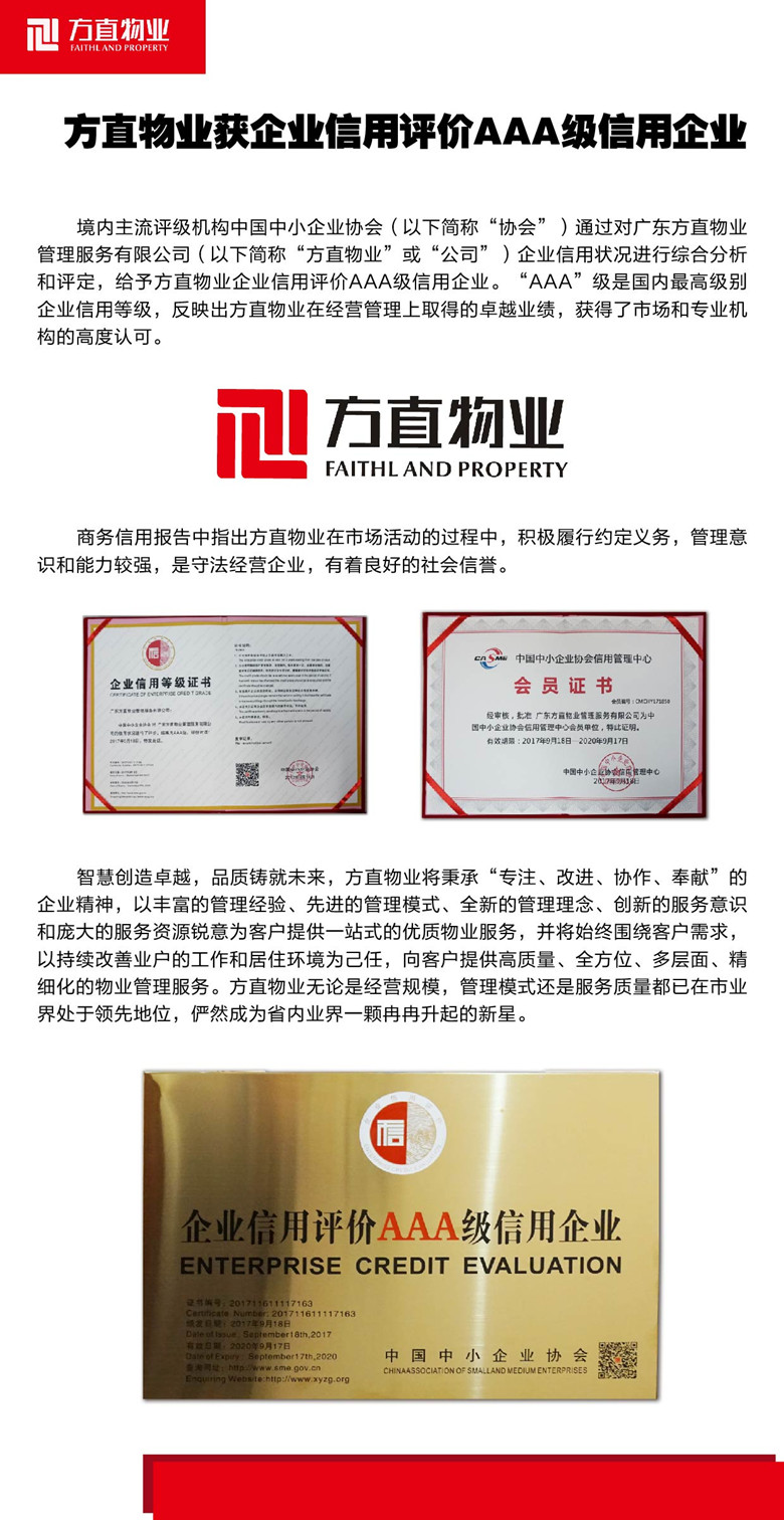 方直物業(yè)獲企業(yè)信用評價AAA級信用企業(yè)