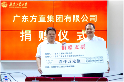 2019年10月9日,“方直獎學金”捐贈儀式在廣東工業大學大學城校區行政樓舉行。方直集團董事長陳專先生向學校捐贈1000萬元,廣工校黨委書記、校長陳新教授為方直集團頒發捐贈證書,并在方直設立“廣東工業大學校外實習基地”。