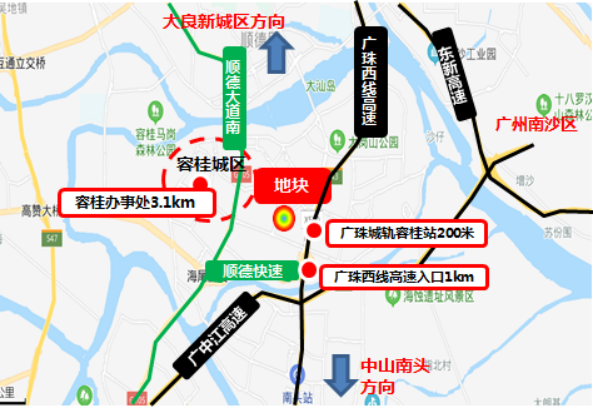 地塊位于容邊社區桂洲大道東,緊鄰容桂輕軌站,最高計容建面386423.93㎡,地塊16分鐘直達廣州南站,臨近廣珠西線高速、碧桂路、105國道等道路,可快速通達大良、中山等地,同時片區還規劃有佛山9號線和13號線。
