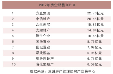 2012年,惠城仲愷樓市仍將是幾個大型開發商唱主角的劇情,而有望成為惠州市區繼江北后又一大高端人居聚集區的金山湖片區,將是其中最重要的舞臺。”這是2012年初,一位資深業內人士的預測。如今,記者發現,那位業內人士的預測足以堪稱 “劇透”:2012年,仍然是方直、中信、合生、光耀、隆生等大型開發商在唱主角,位列房企簽約銷售額榜前兩名的方直和中信,其旗下熱銷的方直·瓏湖灣、方直·君御、方直·城市時代和中信凱旋城、中信水岸城等樓盤全部位于金山湖片區,而且中信凱旋城還是惠城仲愷單盤的簽約銷售套數、面積和金額榜的“三料冠軍”。同時,這兩大房企的銷售額都超過了20億元,合計超過43億元。